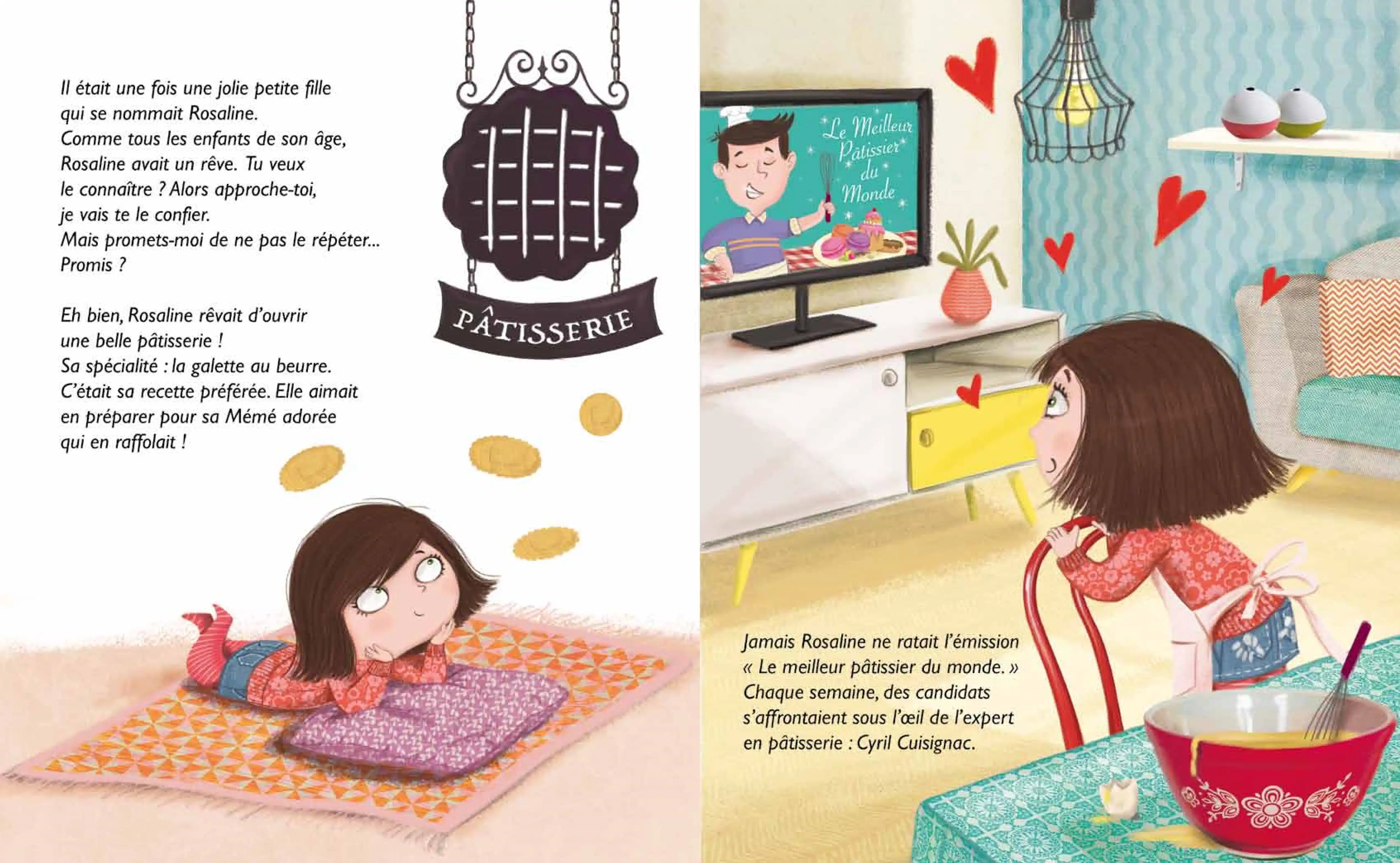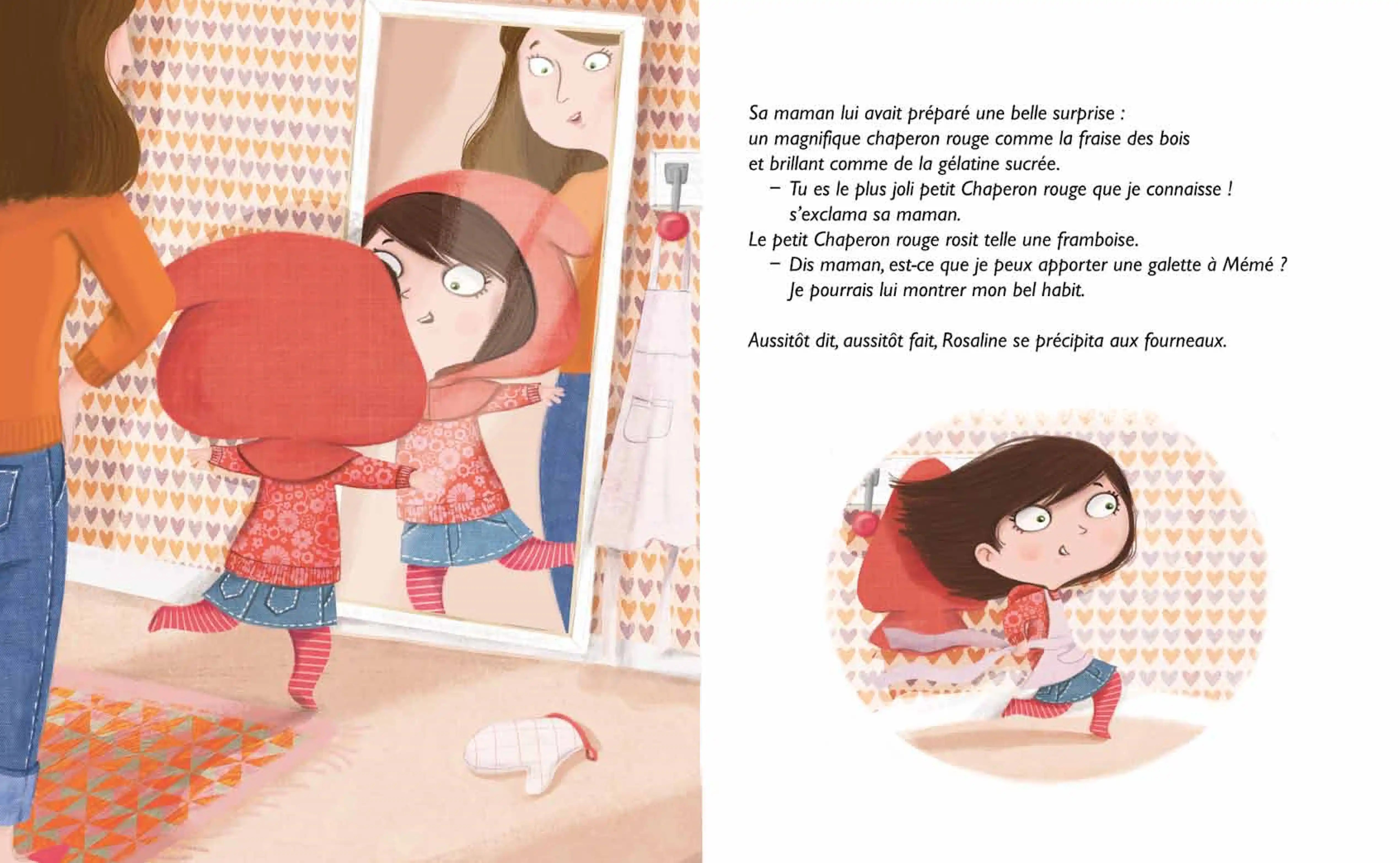 Il était une fois une jolie petite fille qui se nommait Rosaline et qui rêvait d’ouvrir une belle pâtisserie. Sa spécialité : la galette au beurre. Sa maman lui avait préparé une surprise : un magnifique chaperon rouge comme la fraise des bois et brillant comme de la gélatine sucrée.