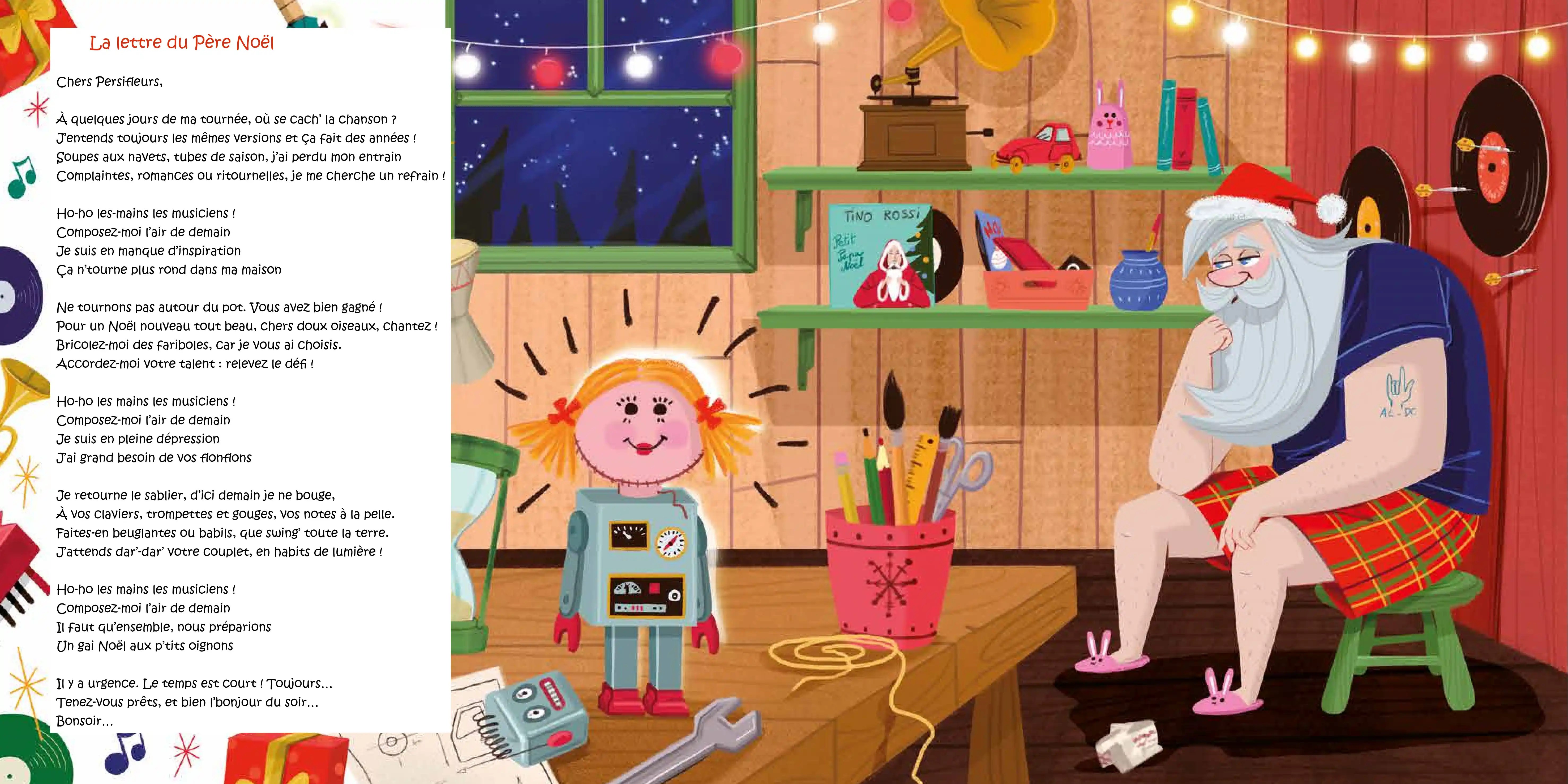 Chaque année, le Père Noël sort une chanson pour les enfants. Cette fois-ci, il s’adresse aux Persifleurs, Chris et JB, pour lui composer LE tube de Noël. Pas si fastoche pour nos deux musiciens qui ont un peu oublié la magie de Noël.
