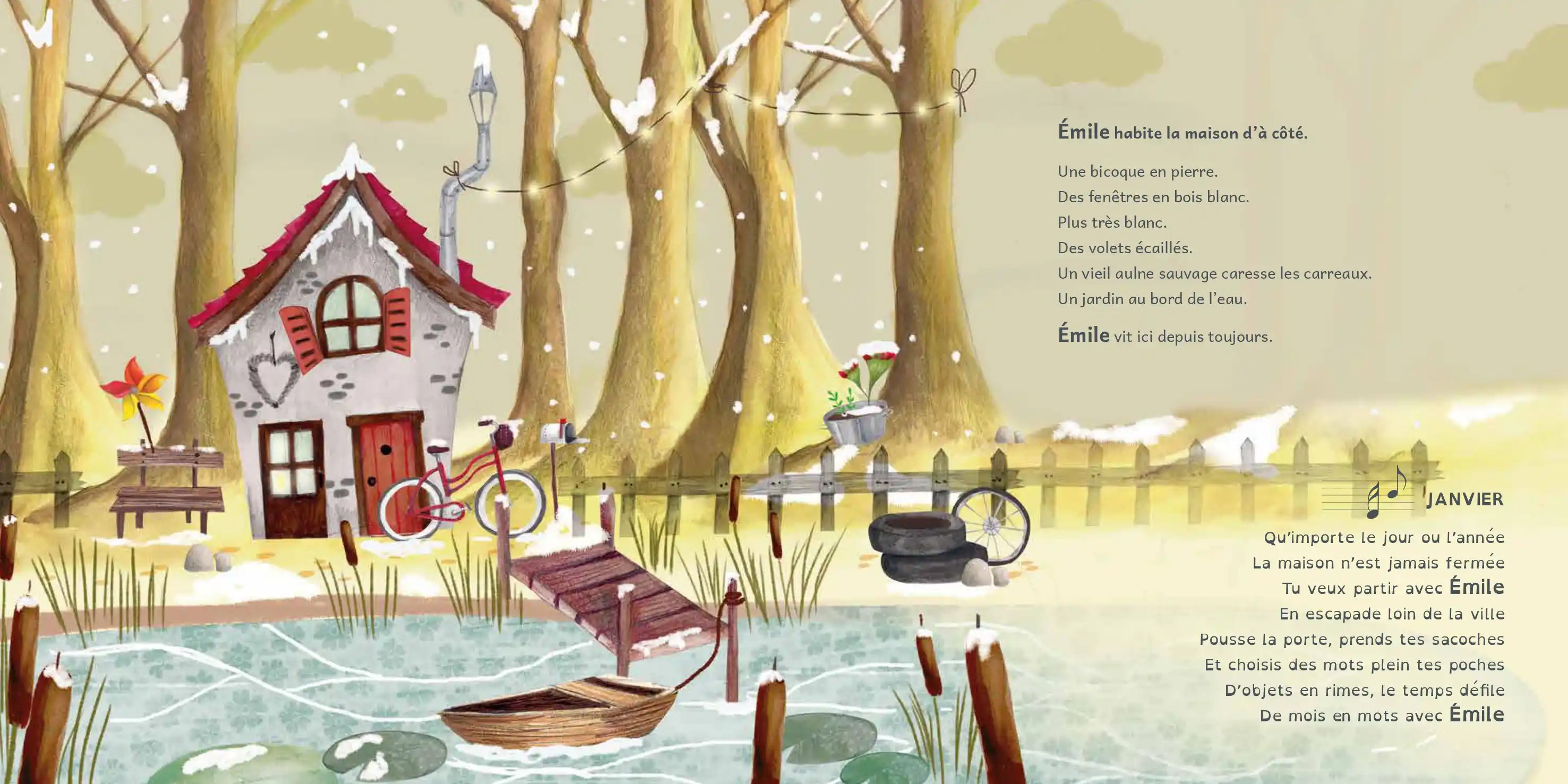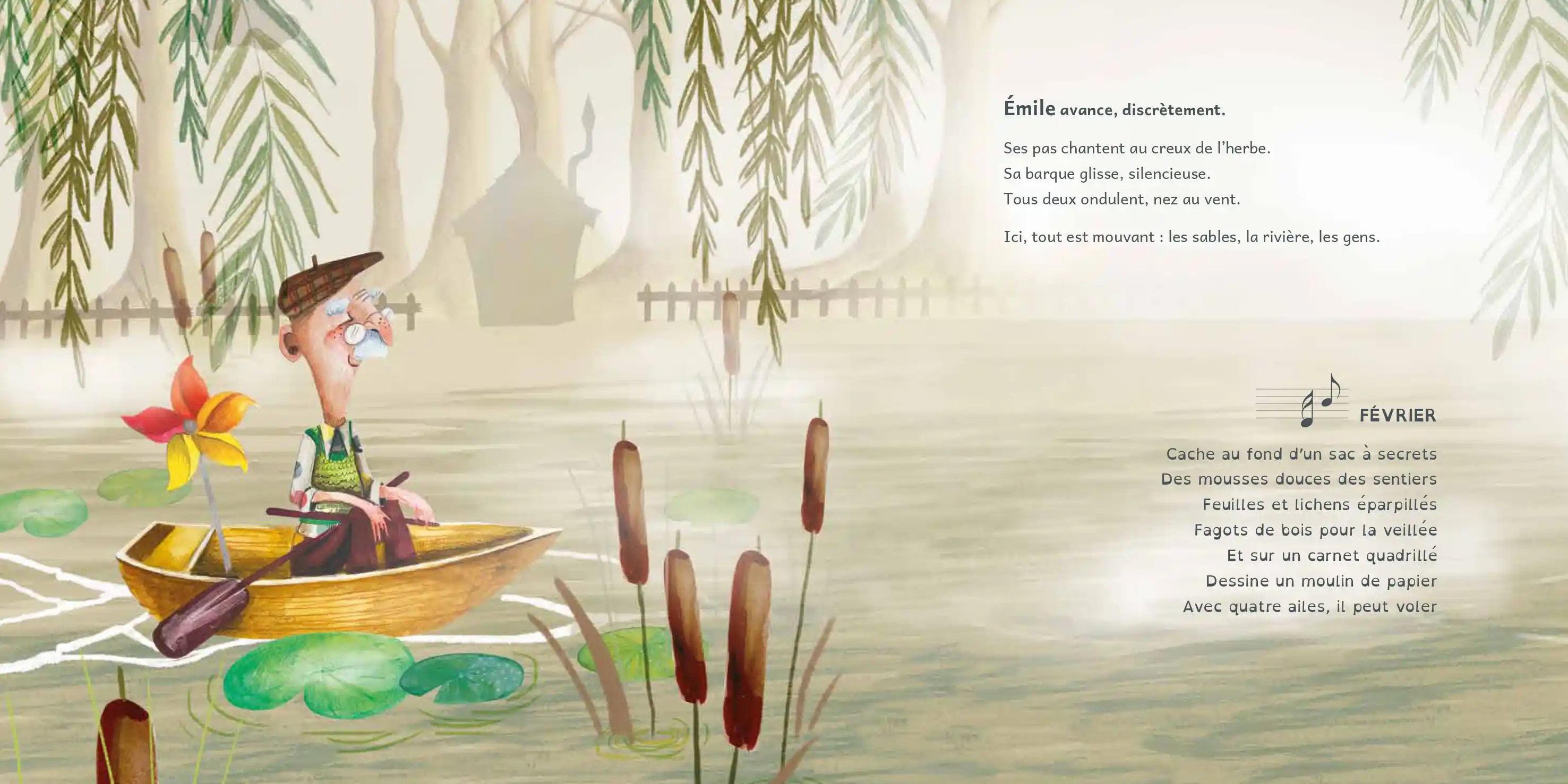 Émile vit dans une bicoque en pierre aux fenêtres en bois blanc. Du jardin au bord de l’eau, un vieil aulne sauvage caresse les carreaux. Sur sa barque, Émile ramasse des mots, des souvenirs en boîte qu’il cache au fond de ses galoches ou de ses poches.