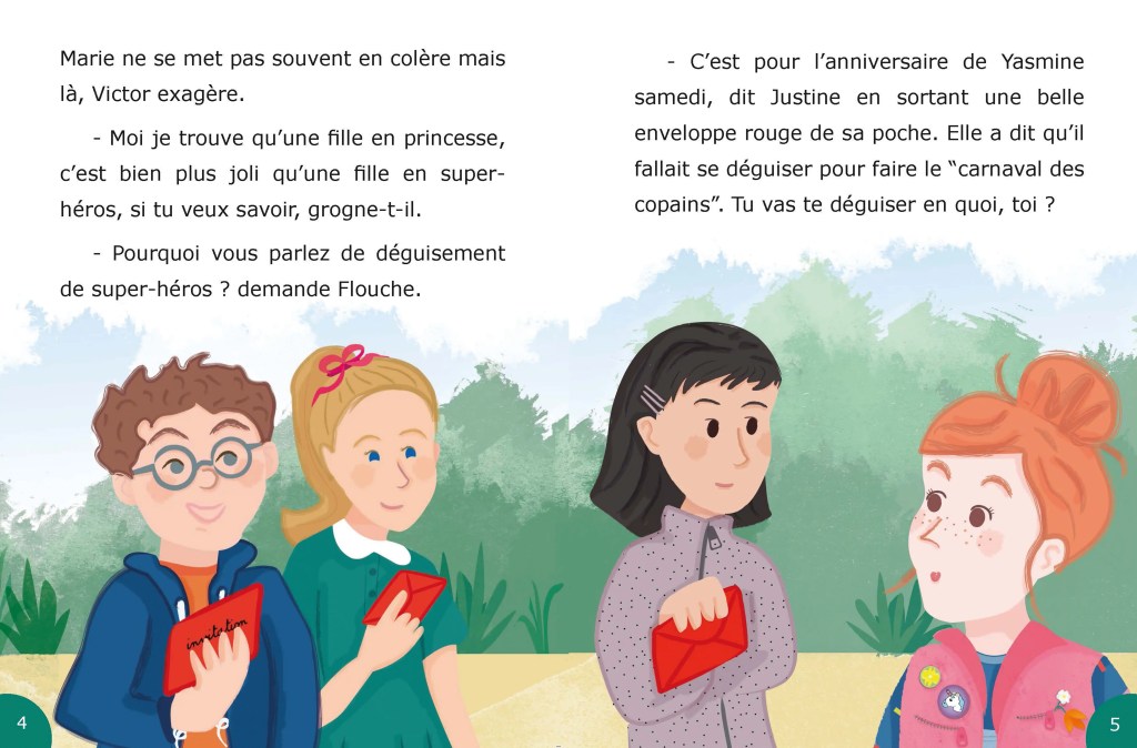 Quand Flouche, de son vrai nom Hélène, arrive à l’école ce matin-là c’est l’effervescence ! Yasmine distribue de belles enveloppes rouges pour inviter tous ses camarades à son anniversaire.