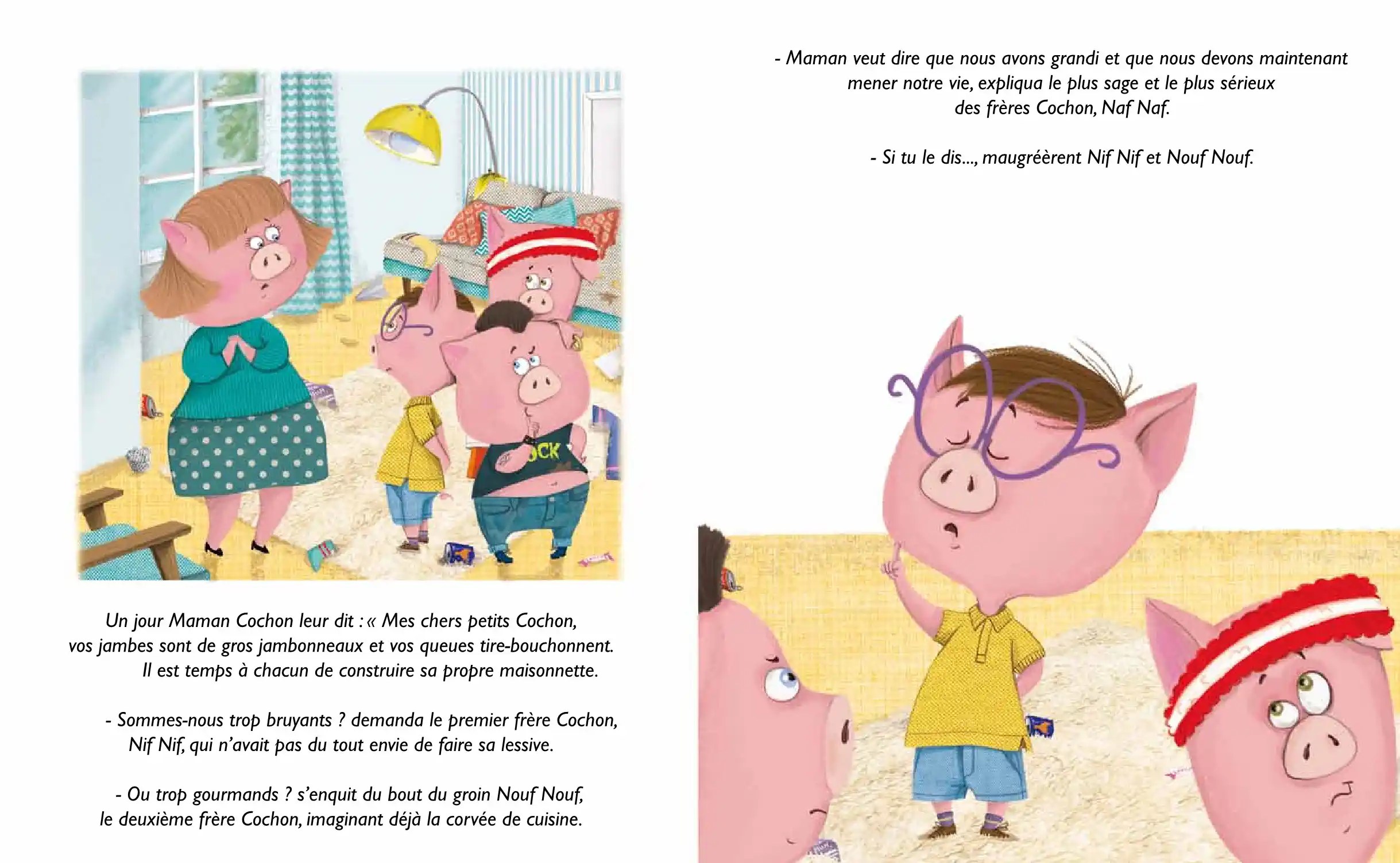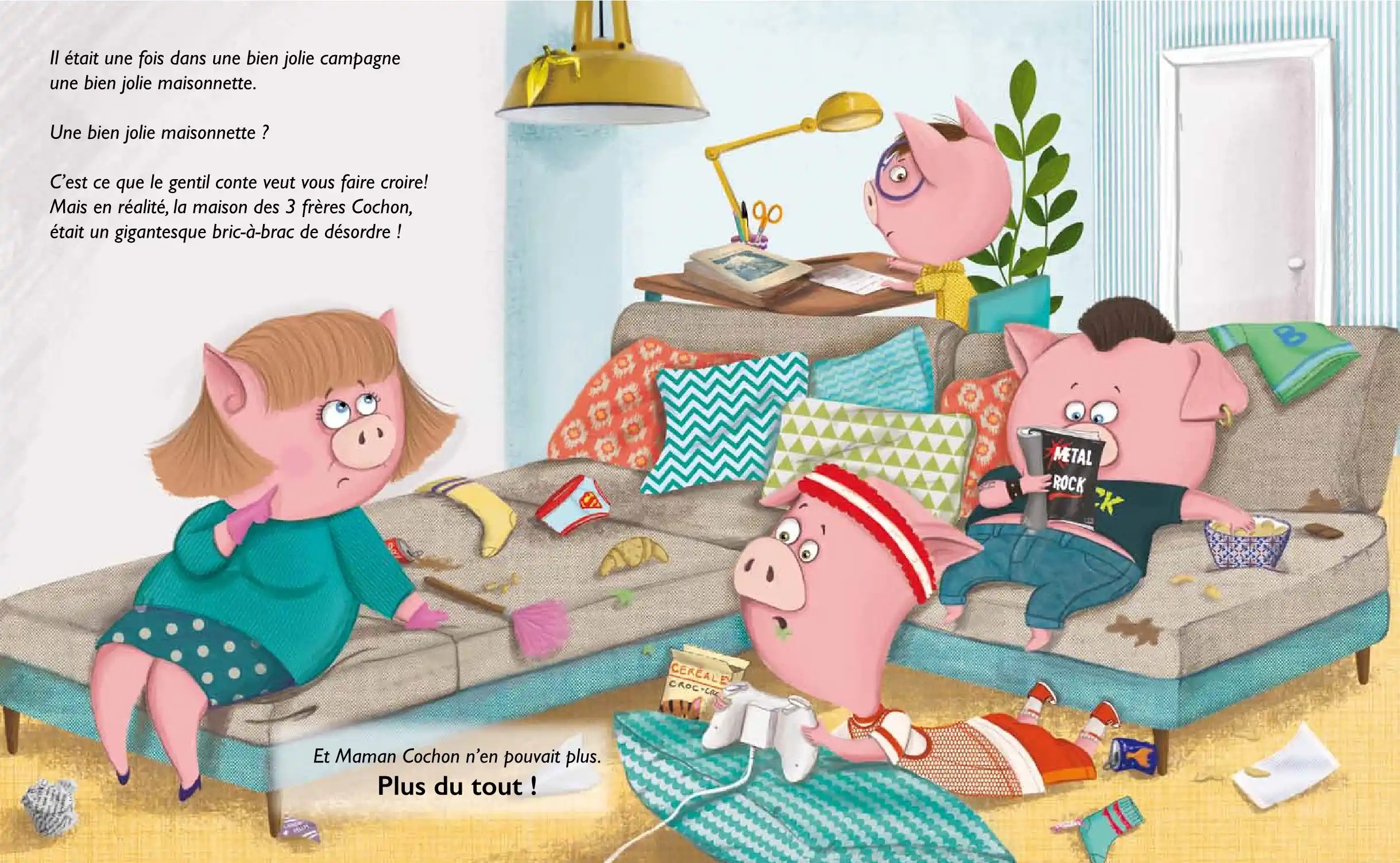 Il était une fois dans une bien jolie campagne une bien jolie maisonnette… Une bien jolie maisonnette, la maison des 3 frères Cochon ? Non, c’était plutôt un gigantesque bric-à-brac de désordre, de chaussettes sales et sucettes collées à la moquette ! Et Maman Cochon n’en pouvait plus. Plus du tout ! Ni une, ni deux, elle les fiche à la porte. CLIC CLAC !