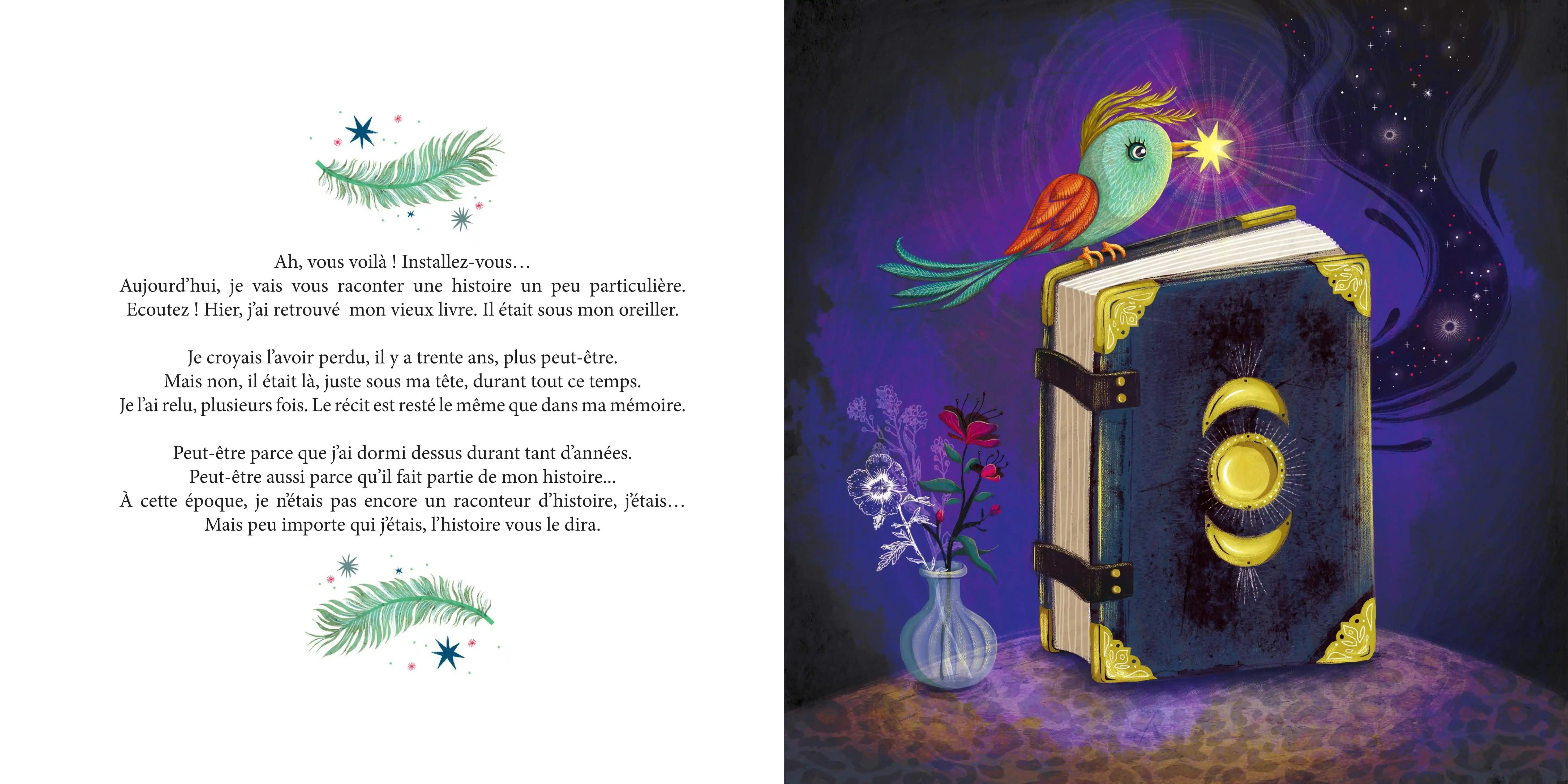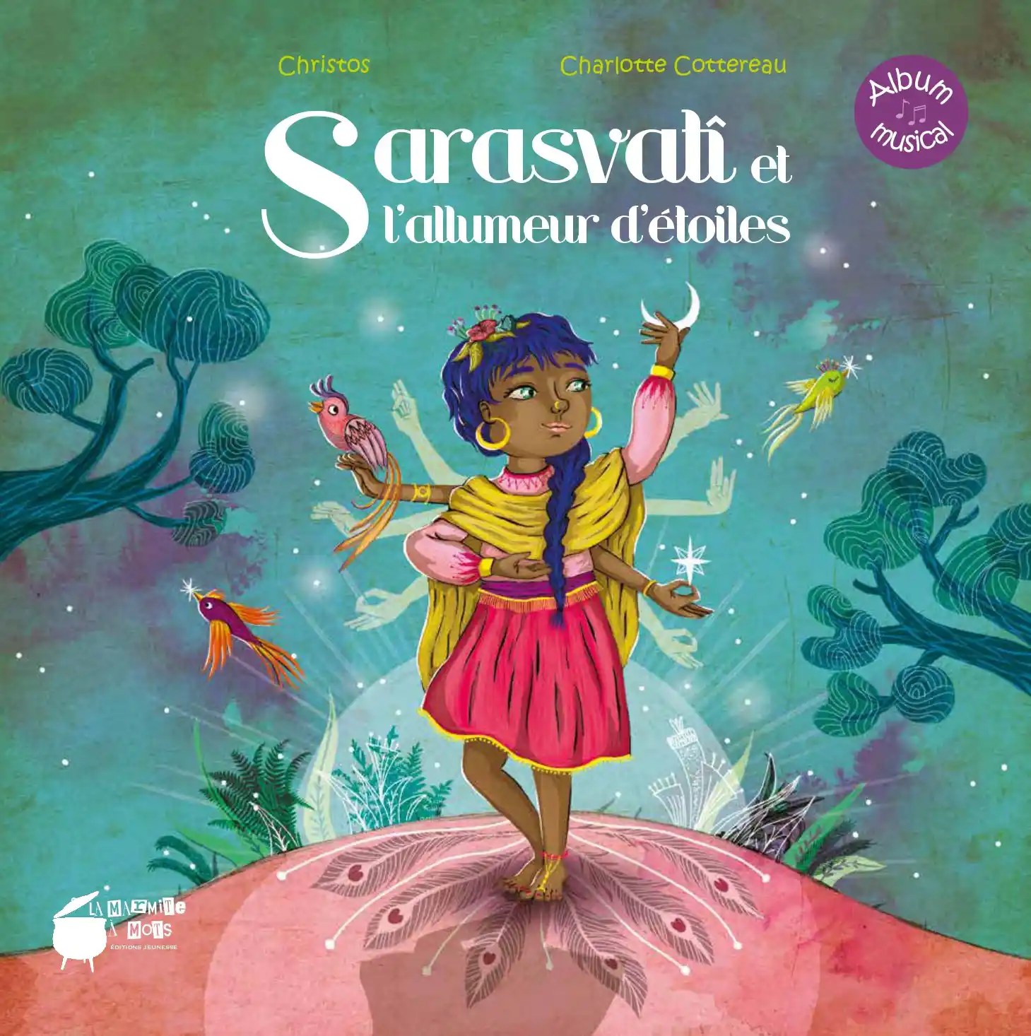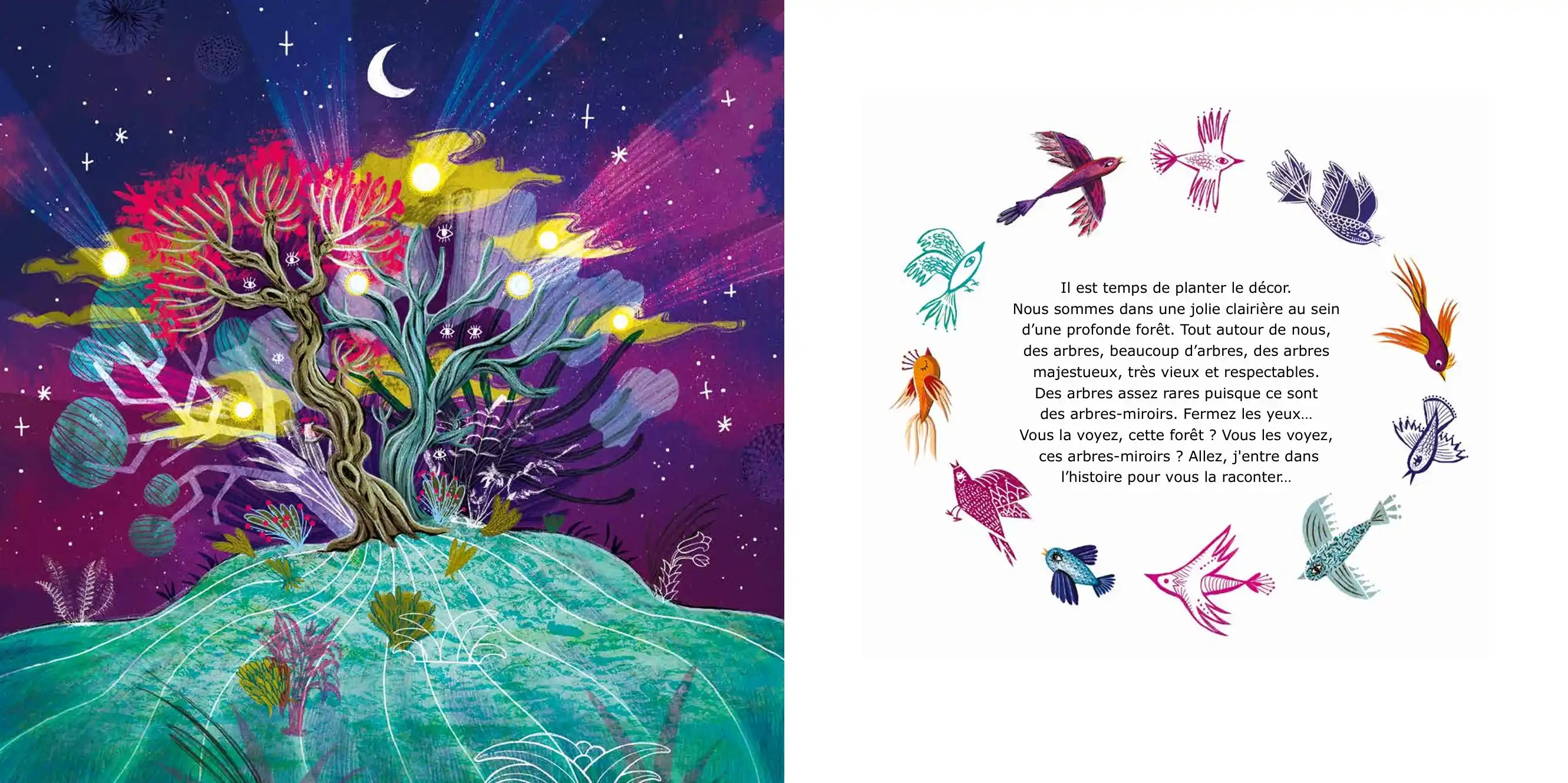 Dans la clairière aux arbres-miroirs, les rêveurs et rêveuses se retrouvent au clair de lune. Sarasvati, elle, se rêve danseuse des Mille et une nuits. Dès qu’elle danse, dans la pénombre tout devient possible. Et l’allumeur d’étoiles, assis en équilibre sur l’astre de nuit, fait chanter son Hang quand elle valse à s’en étourdir.