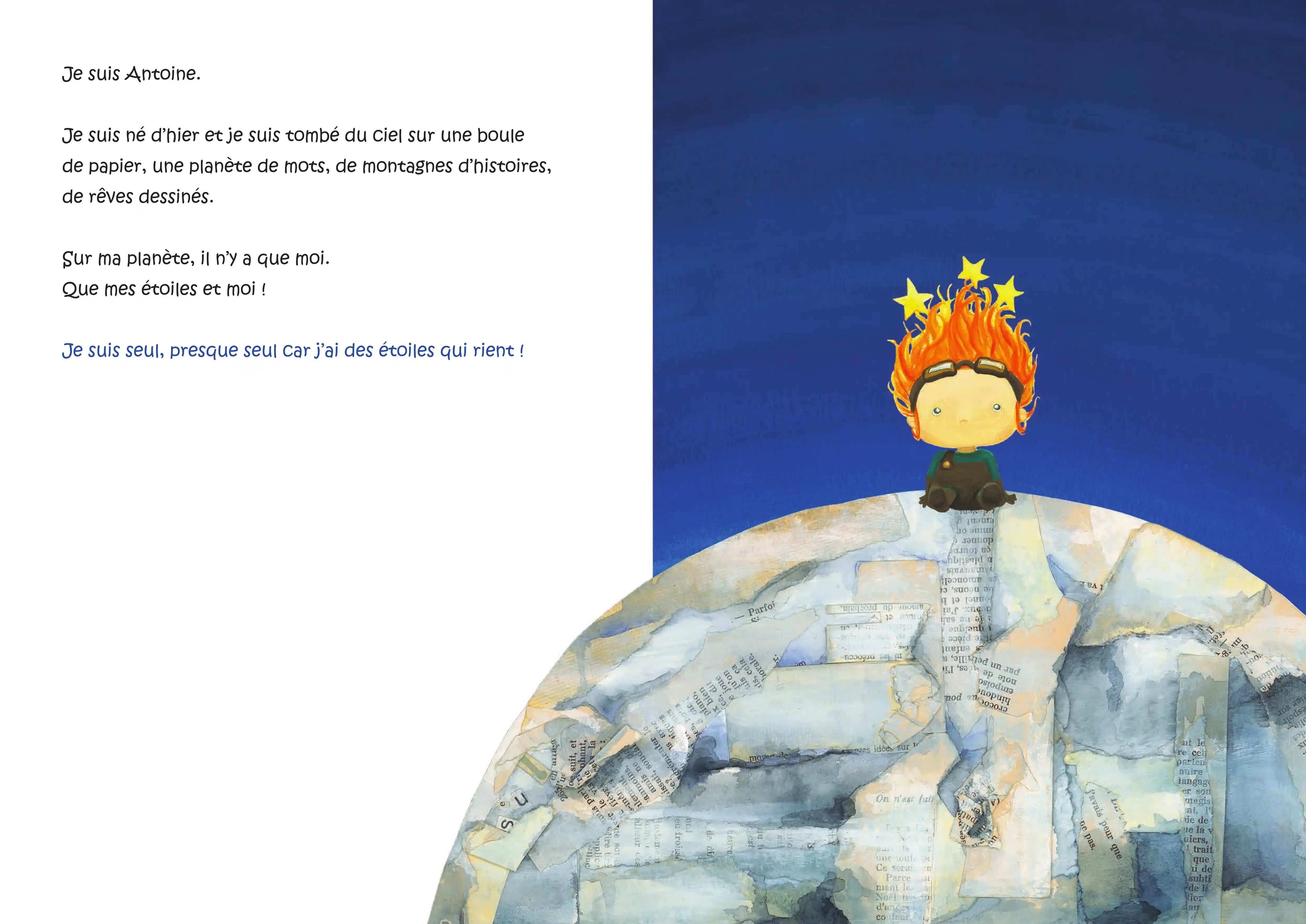 « Je suis Antoine. Je suis né d’hier. Je suis tombé du ciel sur une boule de papier, une planète de mots, de montagnes d’histoires, de rêves dessinés. ».