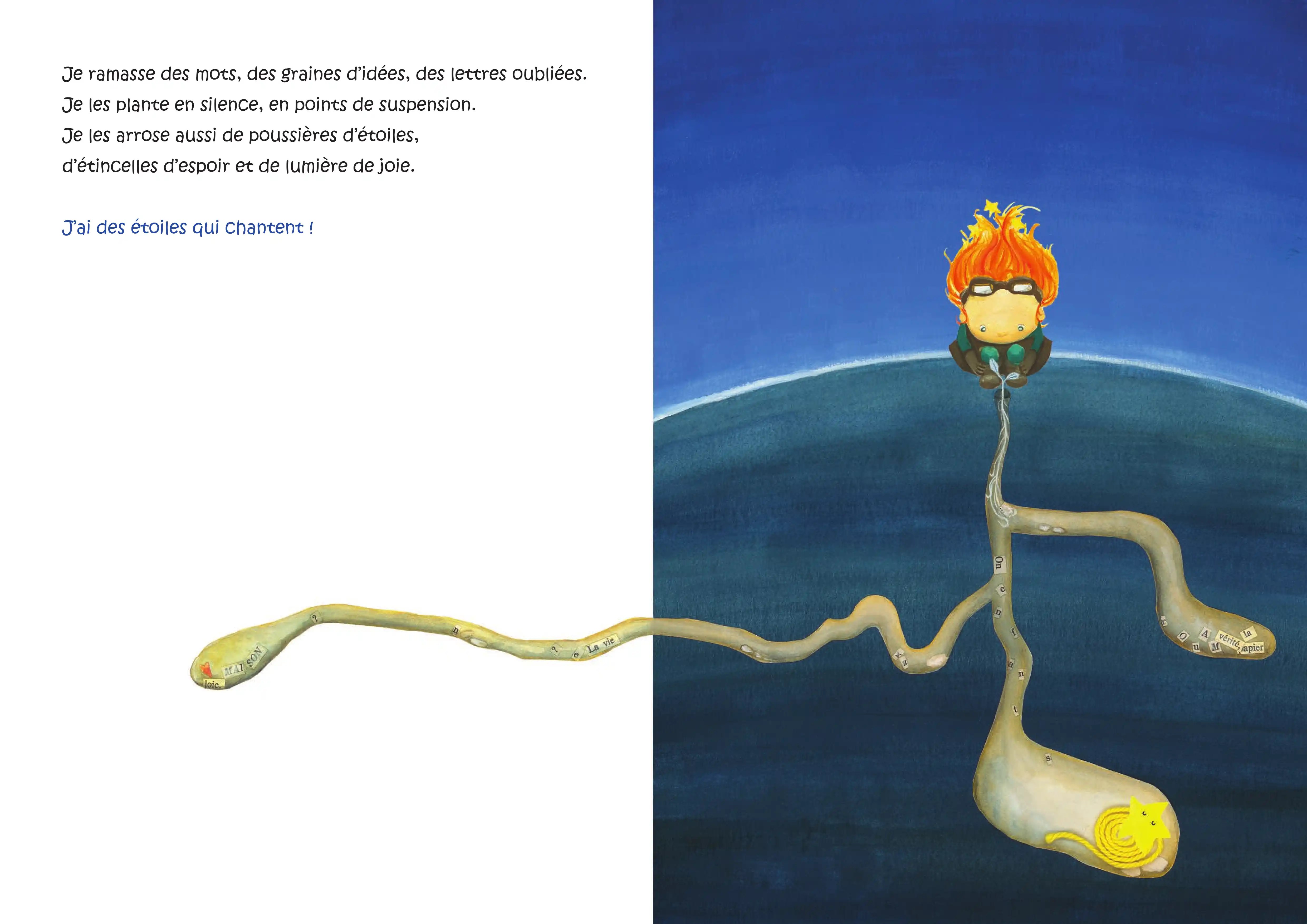 Mais sur sa planète, Antoine est seul. Alors, pour se faire un ami, il écrit sur du papier à l’encre sympathique : des mots complices en majuscules, des mots secrets en minuscules… Et au matin, quand il s’éveille, Johan le géant de papier lui tend la main.